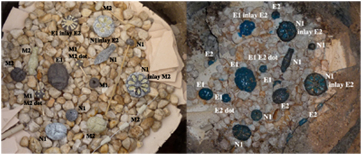 NI. This had a light grey centre with a darker grey at the edge of the base. It had flecks of interparticle blue glass throughout the body. A thin layer of blue/green surrounded the whole piece. This piece had an inlay of E2 that had a very thin turquoise glassy layer on the surface and lighter blue underneath. It had vitrified right through. It appears to have been become very fluid during the firing, as it overflowed and ran beneath the piece and became fused to the quartz that it was resting on.